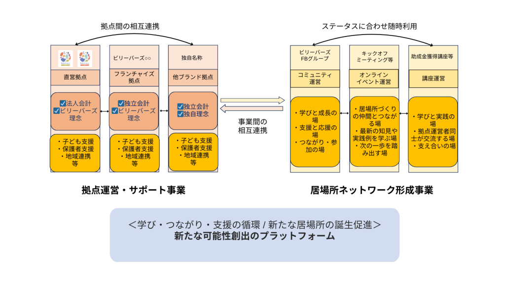 ビリーバーズは、「拠点運営・サポート事業」 と 「居場所ネットワーク形成事業」 の2つの柱を軸に、子どもたちが安心して過ごせる居場所づくりを支援し、その輪を全国へと広げています。